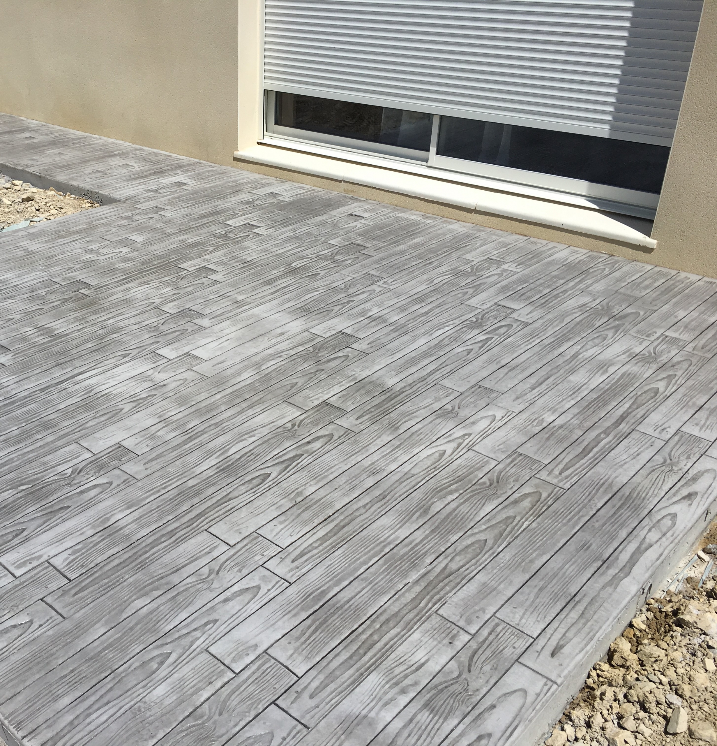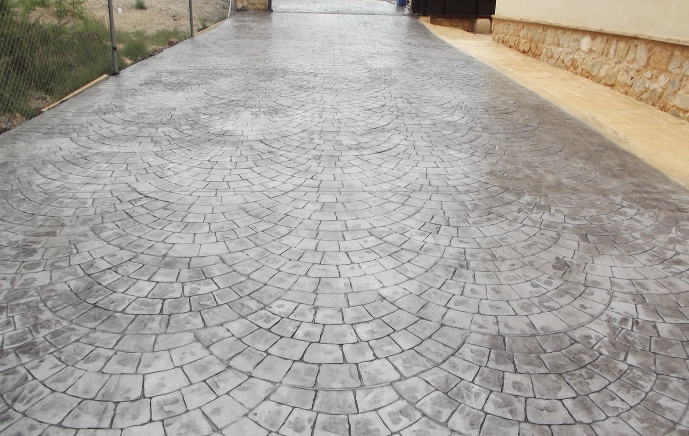 Il s’obtient en imposant une empreinte sur la surface fraîchement lissée. Un procédé rapide dans lequel entrent en jeu durcisseurs minéraux colorés, agents démoulant et résines de finition antitaches. Des matrices d’impression de toutes sortes sont utilisées, en général moulées en polyuréthane semi-rigide. Selon les formes et les teintes employées le béton marqué peut ainsi offrir un aspect de dallage, pavage, pierre naturelle, plancher bois…